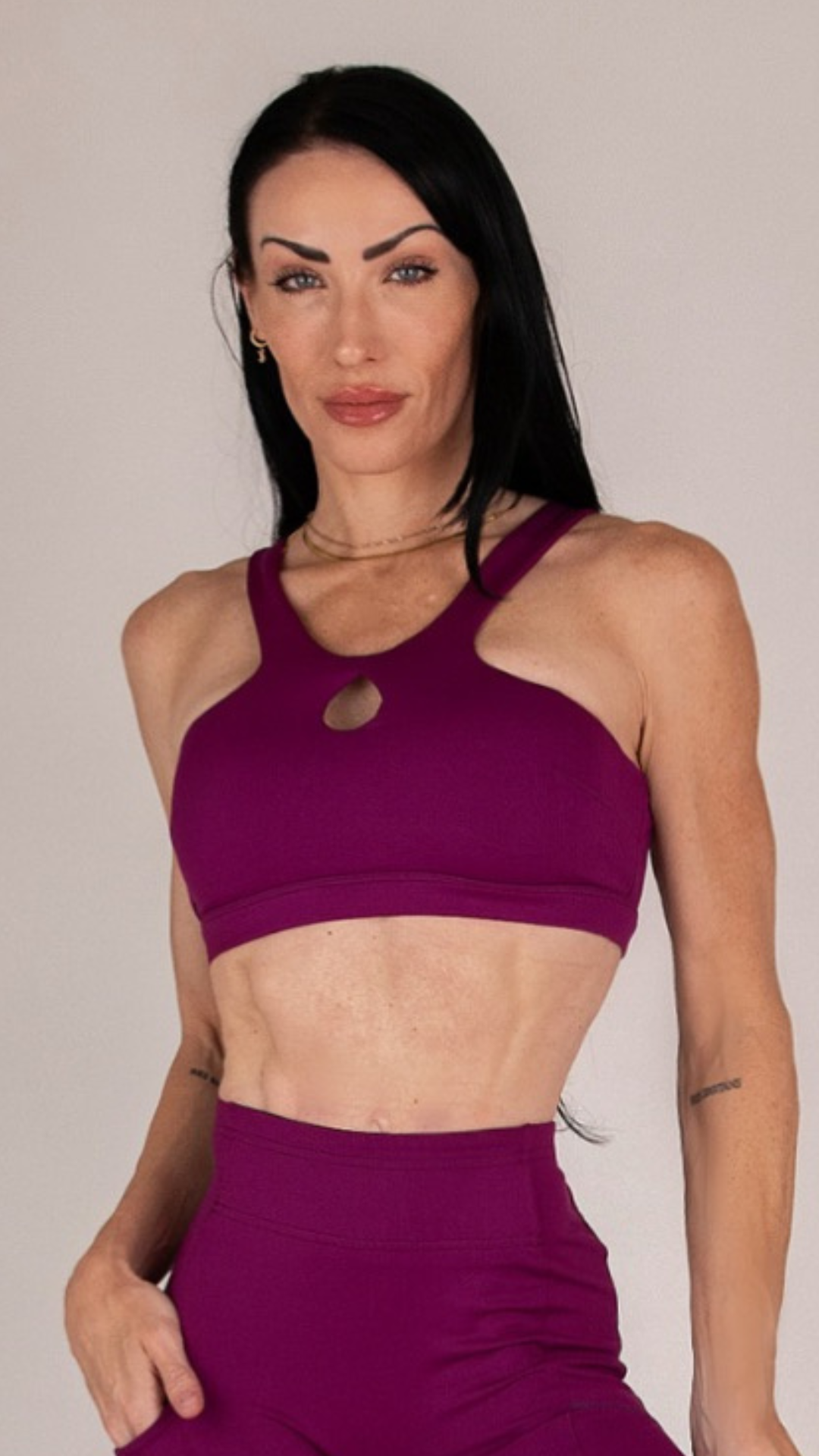 Elevate your performance with a sports bra that seamlessly blends support, structure, and sophistication. Designed for high-impact movement, this bra features a scuba diamond neckline and a mini keyhole cutout at the chest, offering a striking yet functional aesthetic. The architectural back cutouts not only enhance airflow but also create a sculptural element, setting this design apart.