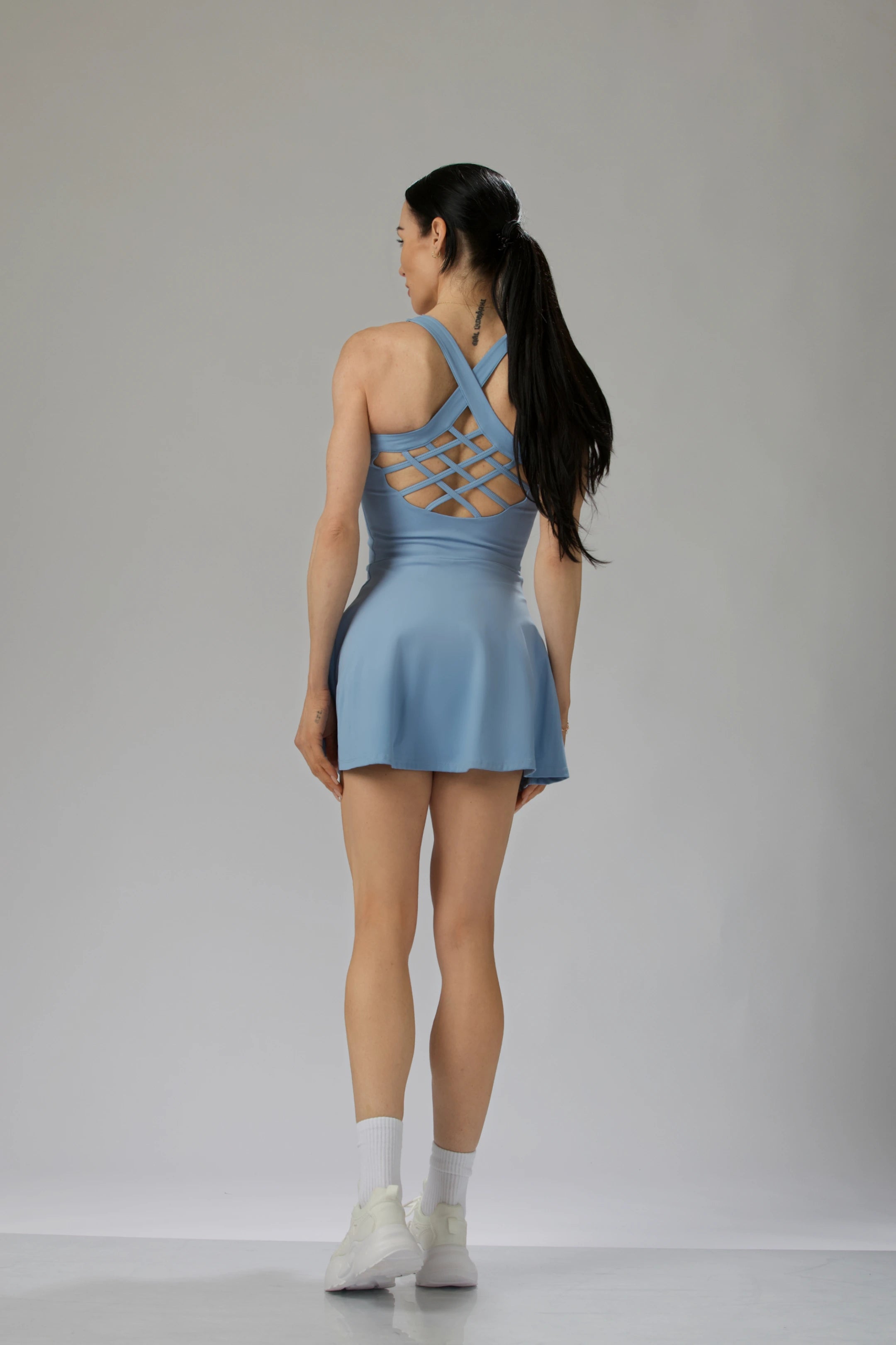 Designed for movement and elegance, this performance mini dress seamlessly blends functionality with style. Featuring a sculpting bodice, a lattice-back detail for breathability, and a flared skirt, it offers a flattering silhouette perfect for active and casual wear.